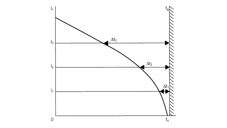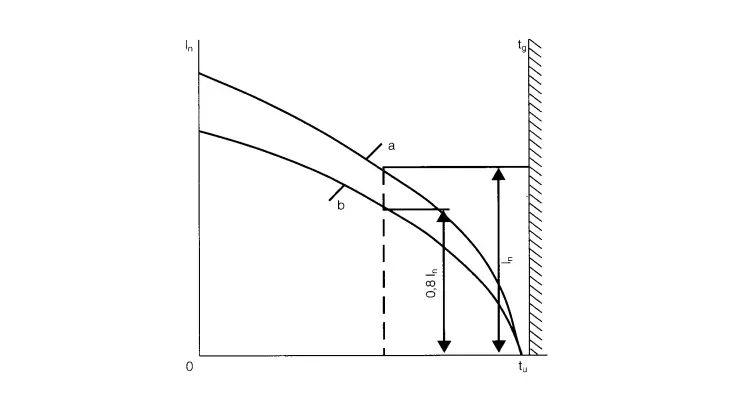 コンポーネントの上限温度tgでx軸に垂直に描かれた線分によって座標が完成します。垂直線の左側の電流I1,I2,...毎に、コンポーネントの温度上昇の関連平均値Δ t1 = tb1-tu1、 Δ t2 = tb2-tu2、...をプロットします。この方法で作成された点をつなぐと、ほぼ放物線状の曲線ができます。